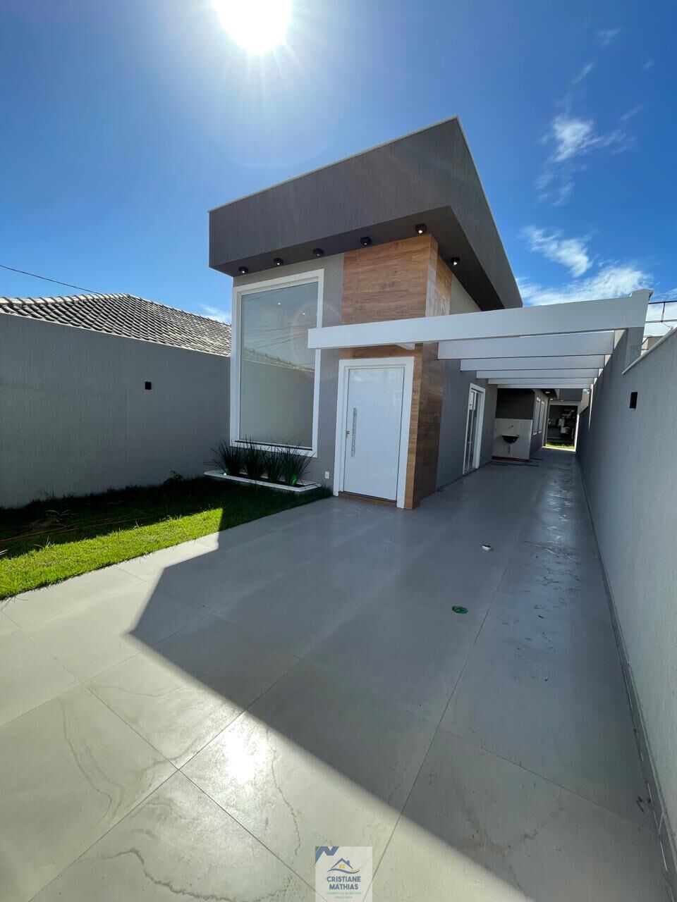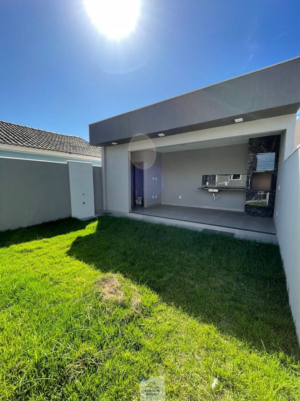 A parte externa da casa é um verdadeiro oásis, com um chuveirão para se refrescar nos dias quentes, um quintal gramado atrás e piso na lateral e frente, tudo emoldurado por um lindo pergolado. E para completar, a casa toda em porcelanato traz um toque de sofisticação único.