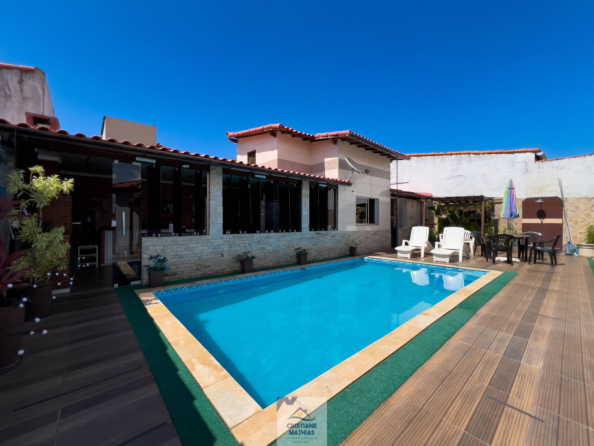- **Área de Lazer:** Desfrute de momentos inesquecíveis na sua própria área de lazer, que conta com uma piscina de 3,50x6,50m, ideal para se refrescar nos dias quentes. O chuveirão proporciona um toque especial para os dias de verão, enquanto o anexo com churrasqueira, forno e fogão a lenha garante que suas confraternizações sejam sempre um sucesso. Com 1 banheiro e 1 quarto adicionais, este espaço é perfeito para receber hóspedes ou criar um ambiente de apoio nas suas festas.